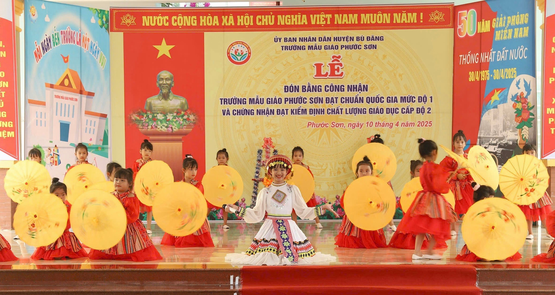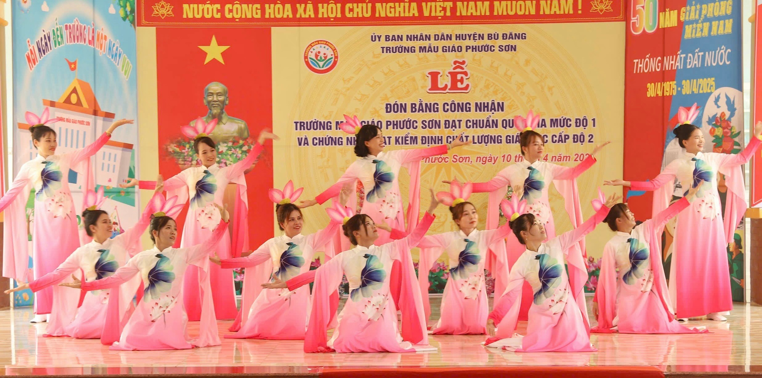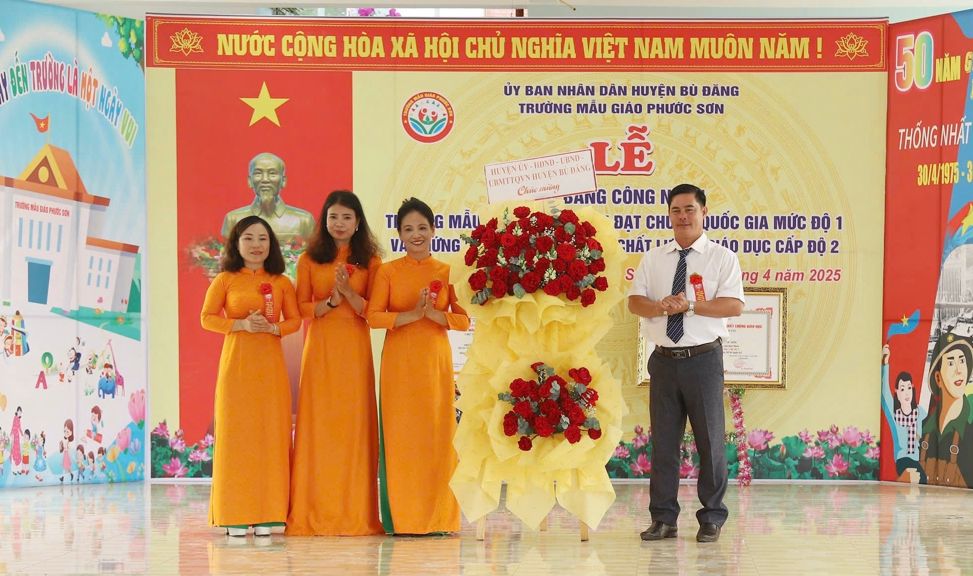 Sáng ngày 10 - 4, Trường Mẫu giáo Phước Sơn, xã Phước Sơn, huyện Bù Đăng, long trọng tổ chức lễ đón Bằng công nhận trường đạt chuẩn Quốc gia mức độ 1 và công nhận đạt kiểm định chất lượng giáo dục Cấp độ 2. Về dự lễ có bà Vũ Thị Kim Huệ - Phó Trưởng phòng giáo dục Tiểu học-Mầm non Sở GD&ĐT; ông Nguyễn Văn Phát – Trưởng phòng GD&ĐT huyện; ông Bùi Xuân Thế - PCT.UBMTTQVN huyện; lãnh đạo Đảng uỷ, HĐND, UBND, UBMTTQVN xã Phước Sơn, đại diện Ban Giám hiệu các trường Mẫu Giáo, Mầm Non trên địa bàn huyện.