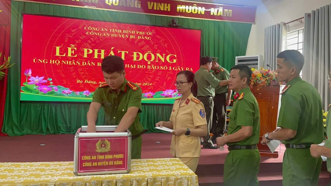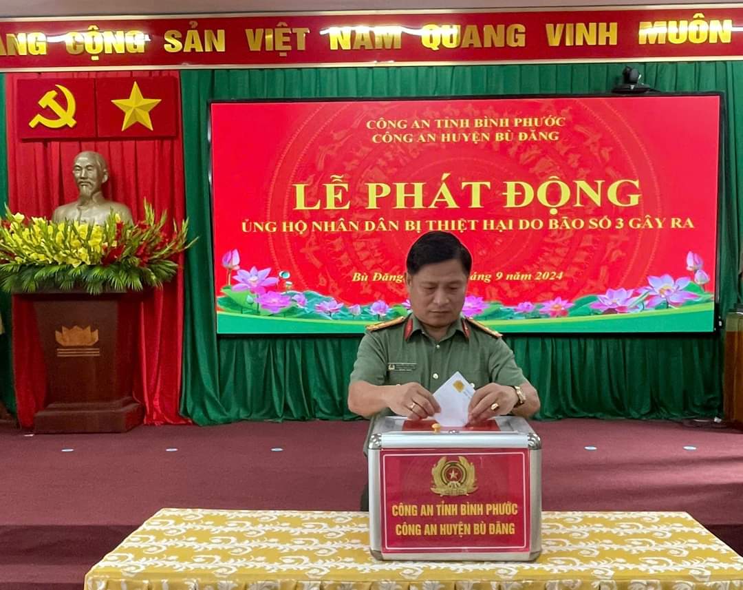 Thượng tá Nguyễn Tấn Phát – Ủy viên Ban Thường vụ, Trưởng Công an huyện và Cán bộ, chiến sỹ Công an huyện Bù Đăng ủng hộ Nhân dân Miền bắc bị thiệt hại do bão số 3.