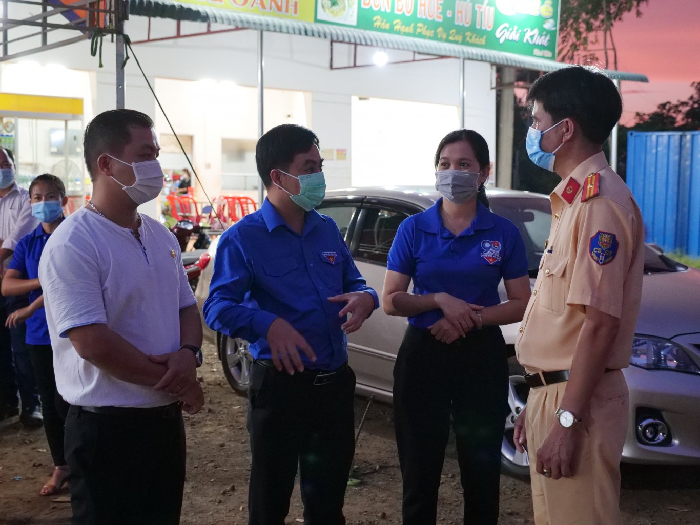 Bí thư tỉnh Đoàn Bình Phước - Trần Quốc Duy (thứ 2 từ phải sang); đại diện câu lạc bộ khởi nghiệp Bù Đăng thăm hỏi, động viên tinh thần và tặng quà chiến sỹ làm nhiệm vụ tại chốt kiểm dịch Covid-19 xã Phú Sơn, huyện Bù Đăng. Trước đó, chị Đào Thị Quế - Bí thư huyện Đoàn Bù Đăng đã thay mặt cho tuổi trẻ Bù Đăng tổ chức trao tặng 800 nón chống tia giọt bắn cho các lực lượng làm nhiệm vụ nơi tuyến đầu: Các chiến sỹ làm nhiệm vụ tại chốt kiểm tra xã Phú Sơn (huyện Bù Đăng); Dội làm căn cước công dân – công an huyện Bù Đăng, Trung tâm y tế huyện Bù Đăng, Ban chỉ huy quân sự huyện Bù Đăng và các lực lượng khác làm nhiệm vụ tuyến đầu.