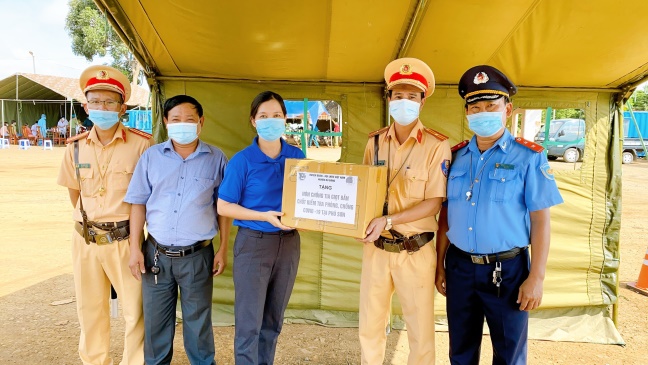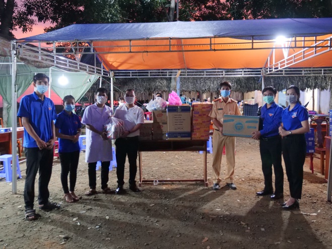 Bí thư huyện Đoàn Bù Đăng – Đào Thị Quế (thứ 3 từ phải sang) thay mặt cho tuổi trẻ Bù Đăng trao tặng nói chống tia giọt bắn cho các chiến sỹ làm nhiệm vụ tại chốt kiểm dịch Covid-19 xã Phú Sơn, huyện Bù Đăng Tổng giá trị quà tặng đợt 1 là 10 triệu đồng từ nguồn đóng góp của các bạn đoàn viên thanh niên, hội viên câu lạc bộ khởi nghiệp Bù Đăng, các mạnh thường quân trong và ngoài huyện. Theo kế hoạch, huyện Đoàn Bù Đăng tiếp tục vận động các mạnh thường quân hỗ trợ các chiến sỹ trong các đợt cao điểm tiếp theo. Những phần quà kịp thời động viên các chiến sỹ làm nhiệm vụ nơi tuyến đầu an tâm công tác, bảo vệ an toàn sức khỏe cho nhân dân, góp phần đẩy lùi dịch bệnh covid-19.