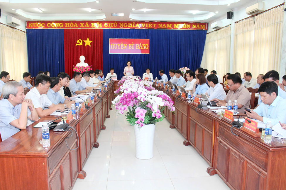 Chiều 11-4, Đồng chí Trần Tuyết Minh, Ủy viên Ban Thường vụ, Phó Chủ tịch UBND tỉnh Trần Tuyết Minh đã có buổi làm việc với UBND huyện Bù Đăng về công tác giải ngân vốn đầu tư công, vốn 3 chương trình mục tiêu Quốc gia và chương trình xóa nhà tạm, nhà dột nát. Cùng dự buổi làm việc có đại diện Ủy ban MTTQ Việt Nam tỉnh; lãnh đạo các sở, ban, ngành liên quan. Đồng chí Vũ Lương Tỉnh ủy viên, Bí thư huyện ủy Bù Đăng, Trần Thanh Tùng Phó Bí thư huyện ủy, Chủ tịch UBND huyện chủ trì buổi làm việc với đoàn.