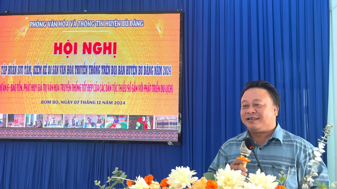 Phát biểu tại Hội nghị, ông Vũ Đức Hoàng – Trưởng Phòng Văn hoá và Thông tin đánh giá công tác kiểm kê di sản văn hóa phi vật thể là nhiệm vụ thiết yếu nhằm nhận diện, xác định giá trị, đánh giá thực trạng, tư liệu hóa, bổ sung danh mục di sản văn hóa phi vật thể, từ đó đề xuất tham mưu với các cấp chính quyền phương án bảo vệ di sản, tránh tình trạng mai một, biến đổi tính chất của di sản. Quá trình kiểm kê cũng góp phần nâng cao nhận thức của cộng đồng và phát huy vai trò là chủ thể văn hóa trong bảo tồn di sản trên địa bàn tỉnh nói chung và huyện Bù Đăng nói riêng.
