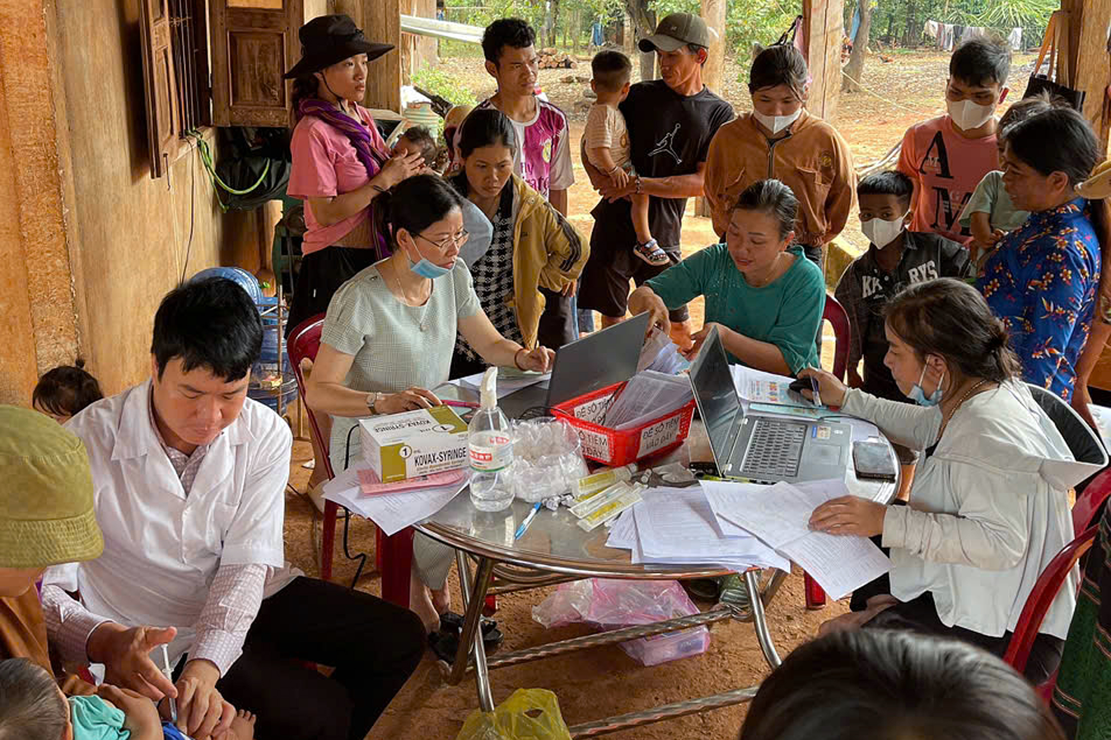 Các y, bác sĩ Trạm y tế xã Nghĩa Trung, thực hiện điểm tiêm lưu động tại thôn 8